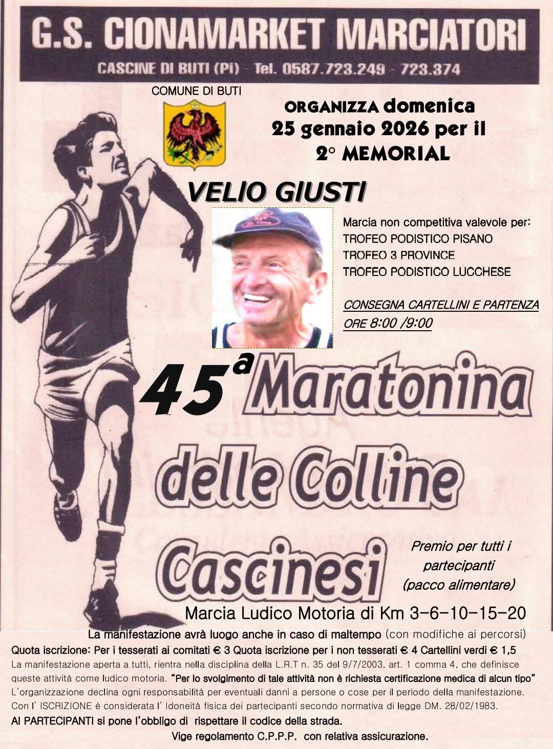 Domenica 25 gennaio appuntamento a Cascine di Buti per la "45a Maratonina delle colline Cascinesi - A Velio", organizzata dal G.S. Cionamarket. Partenza in loc. Ciona, percorsi di km 3-6-10-15-20. Qui potete scaricare il volantino della manifestazione