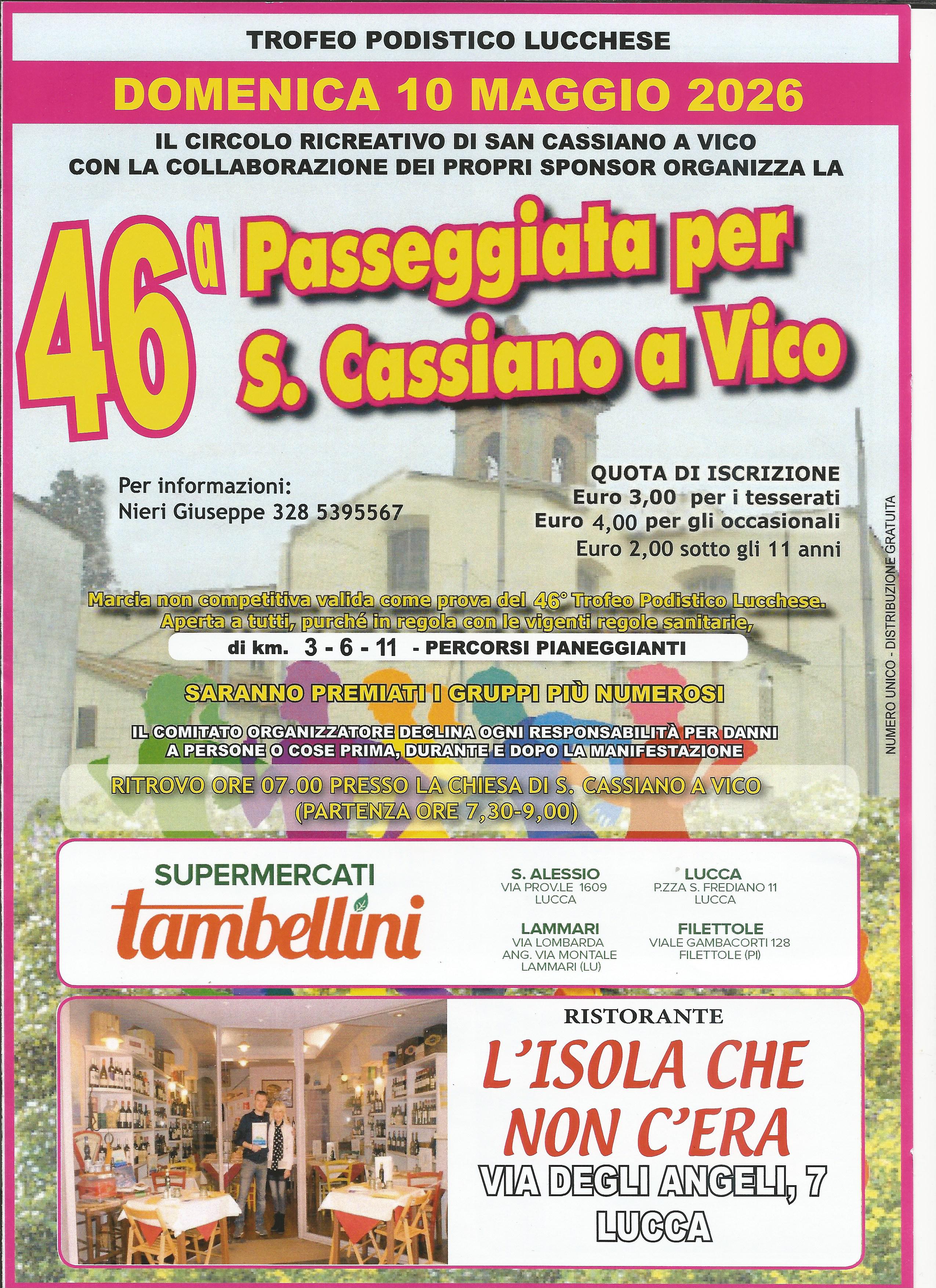 Domenica 10 maggio appuntamento a S. Cassiano a Vico, dove il Circolo Ricreativo organizzerà la "46a Passeggiata per S. Cassiano a Vico". Partenza dalla chiesa parrocchiale, percorsi di km 3, 6, 11. Qui potete scaricare il volantino della manifestazione